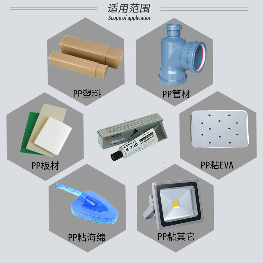 PP、PE、PC、PS、ABS、PVC、EVA、亞克力等塑料的粘接,同時(shí)也可用于PP塑料與金屬、玻璃、海綿、木板、陶瓷、布料等材質(zhì)的大面積粘接及互粘。