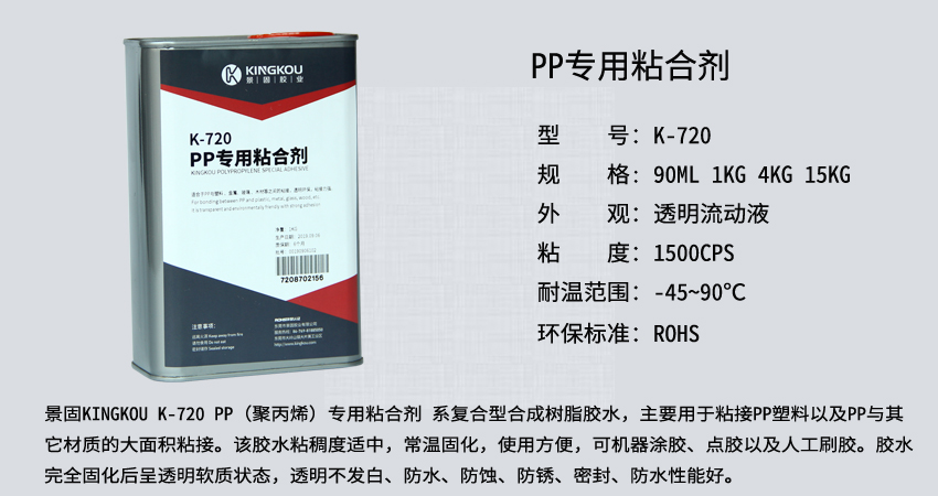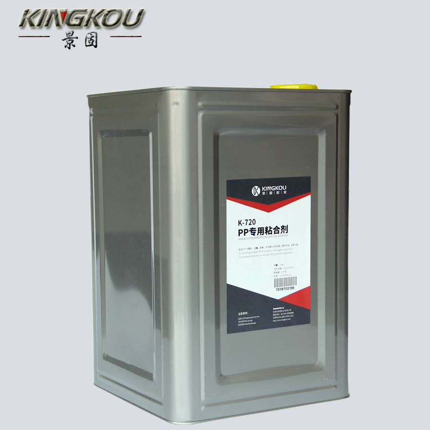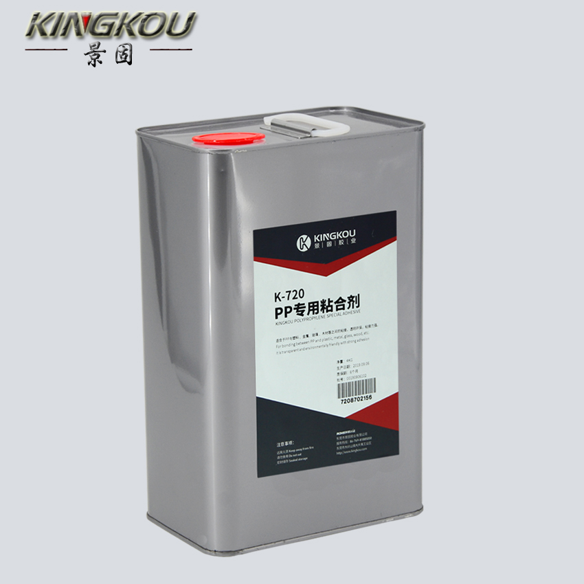 景固KINGKOU K-720 PP(聚丙烯)專(zhuān)用粘合劑 系復(fù)合型合成樹(shù)脂膠水,主要用于粘接PP塑料以及PP與其它材質(zhì)的大面積粘接。該膠水粘稠度適中,常溫固化,使用方便,可機(jī)器涂膠、點(diǎn)膠以及人工刷膠。膠水完全固化后呈透明軟質(zhì)狀態(tài),完全不發(fā)白、防水、防蝕、防銹、密封、防水性能好。