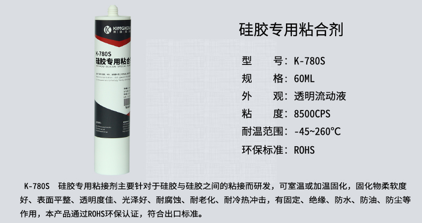 景固KINGKOU  K-780S透明硅膠專用膠水系專業(yè)針對(duì)硅膠材質(zhì)的粘接所研發(fā),避免了傳統(tǒng)膠水粘接硅膠后發(fā)硬變脆、出現(xiàn)白化、氣味重、耐侯性差等缺點(diǎn),該膠透明、環(huán)保、無(wú)刺激性異味、柔軟度好!固化后呈軟質(zhì)彈性狀態(tài),可彎折,不發(fā)白,強(qiáng)度高,耐酸堿,耐高溫,防水性能強(qiáng)!