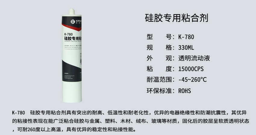 景固KINGKOU K-780透明硅膠專用膠水系專業(yè)針對硅膠與塑料、硅膠與金屬、硅膠與玻璃、木材、絨布、皮革等材質的粘接所研發(fā),避免了傳統(tǒng)膠水粘接后發(fā)硬變脆、出現(xiàn)白化、氣味重、耐侯性差等缺點,該膠透明環(huán)保、無刺激性異味、柔軟度好!固化后呈軟質彈性狀態(tài),可彎折,不發(fā)白,強度高,耐酸堿,耐高溫,防水性能強!