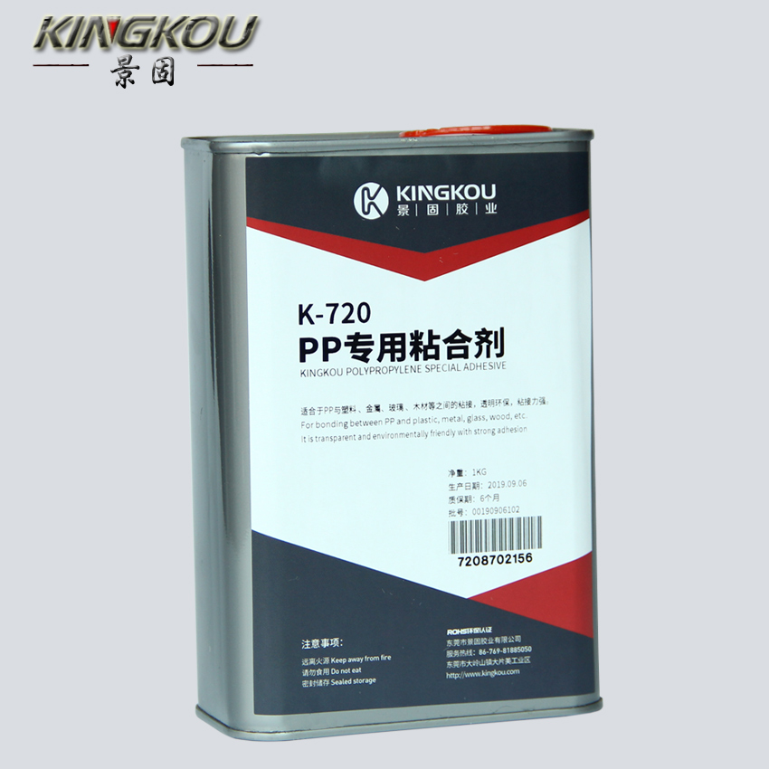 景固KINGKOU K-720 PP(聚丙烯)專用粘合劑 系復(fù)合型合成樹脂膠水,主要用于粘接PP塑料以及PP與其它材質(zhì)的大面積粘接。該膠水粘稠度適中,常溫固化,使用方便,可機器涂膠、點膠以及人工刷膠。膠水完全固化后呈透明軟質(zhì)狀態(tài),完全不發(fā)白、防水、防蝕、防銹、密封、防水性能好。