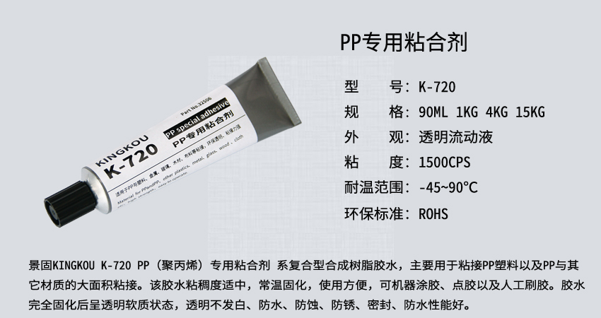 景固KINGKOU K-720 PP(聚丙烯)專用粘合劑 系復(fù)合型合成樹脂膠水,主要用于粘接PP塑料以及PP與其它材質(zhì)的大面積粘接。該膠水粘稠度適中,常溫固化,使用方便,可機(jī)器涂膠、點(diǎn)膠以及人工刷膠。膠水完全固化后呈透明軟質(zhì)狀態(tài),完全不發(fā)白、防水、防蝕、防銹、密封、防水性能好。