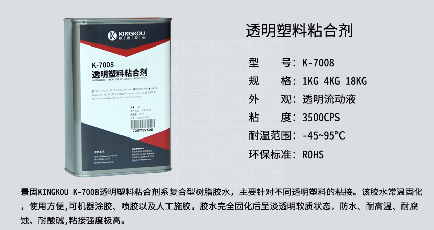 景固KINGKOU K-7008透明塑料粘合劑系復(fù)合型樹(shù)脂膠水,主要針對(duì)不同透明塑料的粘接。該膠水常溫固化,使用方便,可機(jī)器涂膠、噴膠以及人工施膠,膠水完全固化后呈淡透明軟質(zhì)狀態(tài),防水、耐高溫、耐腐蝕、耐酸堿,粘接強(qiáng)度極高。