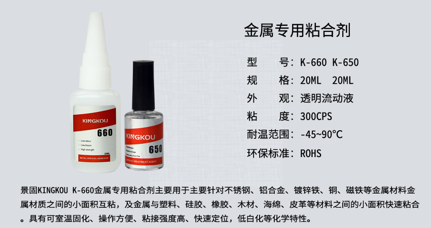 景固KINGKOU K-660金屬專用粘合劑主要用于主要針對(duì)不銹鋼、鋁合金、鍍鋅鐵、銅、磁鐵等金屬材料金屬材質(zhì)之間的小面積互粘,及金屬與塑料、硅膠、橡膠、木材、海綿、皮革等材料之間的小面積快速粘合。具有可室溫固化、操作方便、粘接強(qiáng)度高、快速定位,固化后的膠層具有優(yōu)異的耐水、耐熱、耐油和低白化等化學(xué)特性。本產(chǎn)品符合ROHS環(huán)保標(biāo)準(zhǔn)。