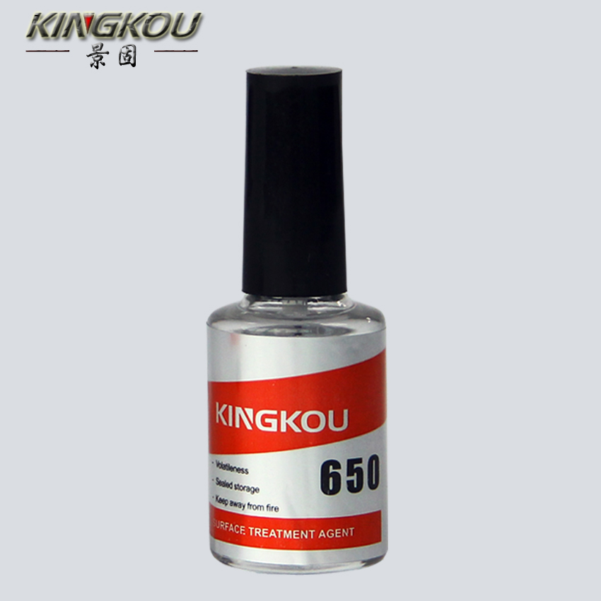 步驟2:處理表面,粘接PP/PE/硅膠/TPU/TPR/TPU等材質(zhì)與金屬時(shí)需要配用本公司K-650表面處理劑來(lái)粘接,擰開K-650表面處理劑黑色蓋子,用蓋子內(nèi)部固定的毛刷蘸試處理劑對(duì)清潔后的PP/PE/硅膠/TPU/TPR/TPU表面進(jìn)行擦試,以處理接著面。