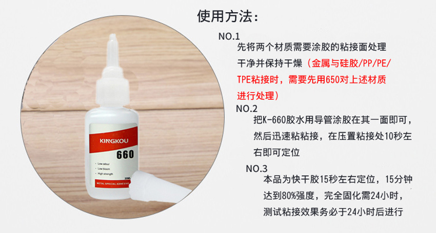 步驟3:產(chǎn)品涂膠,處理劑15秒左右完成揮發(fā)后,擰開K-660金屬專用膠水膠瓶前端一層蓋子,瓶口如有膠水溢出可使用棉布先瓶口膠水擦拭干凈,把我司配的點(diǎn)膠導(dǎo)管用力套在瓶口膠端,導(dǎo)管長(zhǎng)度可根據(jù)具體粘接要求剪至合適的長(zhǎng)度,以控制出膠量,便于點(diǎn)膠。