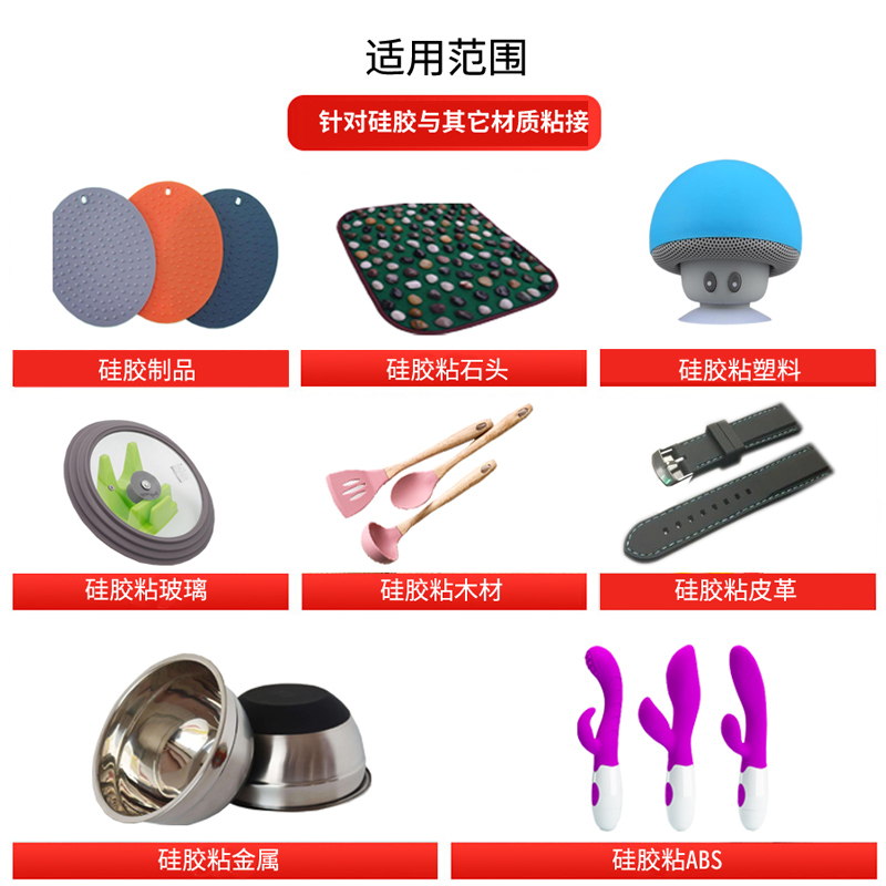 主要用于:硅膠與ABS、硅膠與PS、硅膠與PC、硅膠與PMMA、硅膠與其他塑料、硅膠與金屬(不銹鋼、鋁合金、鐵、銅、合金料)等之間的粘接。固化后柔軟有彈力,粘性強!并且防水、防潮、耐油、耐老化、抗震動、絕緣等特性!