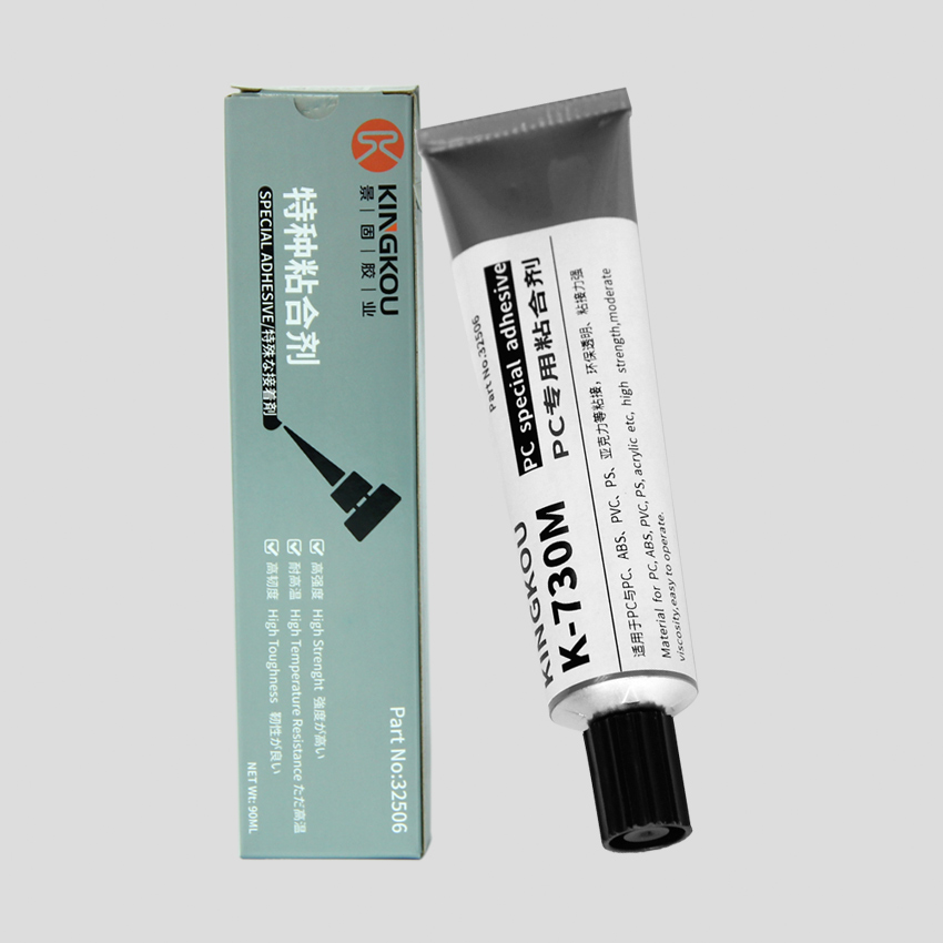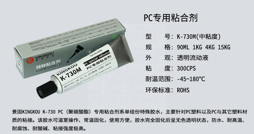 景固KINGKOU K-730 PC(聚碳酸酯)專用粘合劑系單組份特殊膠水,主要針對PC塑料以及PC與其它塑料材質的粘接。該膠水可溫室操作、常溫固化,使用方便,膠水完全固化后呈無色透明狀態(tài),防水、耐高溫、耐腐蝕、耐酸堿、粘接強度極高。