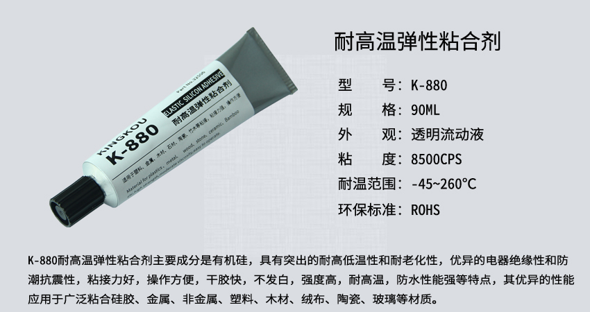 景固KINGKOU K-880耐高溫彈性粘合劑主要成分是有機(jī)硅,具有突出的耐高低溫性和耐老化性,優(yōu)異的電器絕緣性和防潮抗震性,粘接力好,操作方便,干膠快,不發(fā)白,強(qiáng)度高,耐高溫,防水性能強(qiáng)等特點(diǎn),其優(yōu)異的性能應(yīng)用于廣泛粘合硅膠、金屬、非金屬、塑料、木材、絨布、陶瓷、玻璃等材質(zhì),粘接前免處理,固化后膠層呈軟質(zhì)透明狀態(tài)。適用于對溫度有特殊要求的彈性粘接,適用于電力、電子、電器、醫(yī)療機(jī)械、傳感器、機(jī)械設(shè)備、冷凍設(shè)備、造船工業(yè)、汽車工業(yè)、電線電纜的絕緣粘接加固密封保護(hù)等。
