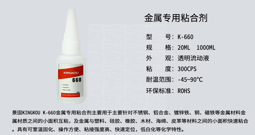 景固KINGKOU K-660金屬專用粘合劑主要用于主要針對不銹鋼、鋁合金、鍍鋅鐵、銅、磁鐵等金屬材料金屬材質(zhì)之間的小面積互粘,及金屬與塑料、硅膠、橡膠、木材、海綿、皮革等材料之間的小面積快速粘合。具有可室溫固化、操作方便、粘接強(qiáng)度高、快速定位,固化后的膠層具有優(yōu)異的耐水、耐熱、耐油和低白化等化學(xué)特性。本產(chǎn)品環(huán)保,符合ROHS標(biāo)準(zhǔn)。