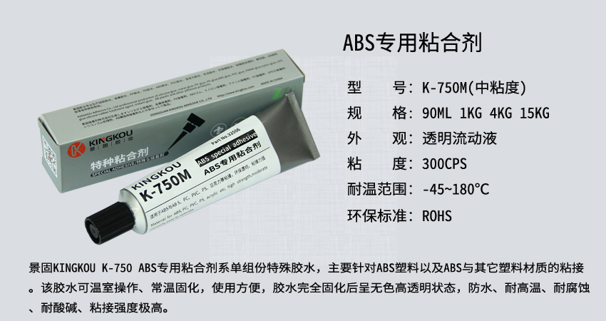 景固KINGKOU K-750 ABS專用粘合劑系單組份特殊膠水,主要針對ABS塑料以及ABS與其它塑料材質(zhì)的粘接。該膠水可溫室操作、常溫固化,使用方便,膠水完全固化后呈無色高透明狀態(tài),防水、耐高溫、耐腐蝕、耐酸堿、粘接強(qiáng)度極高。