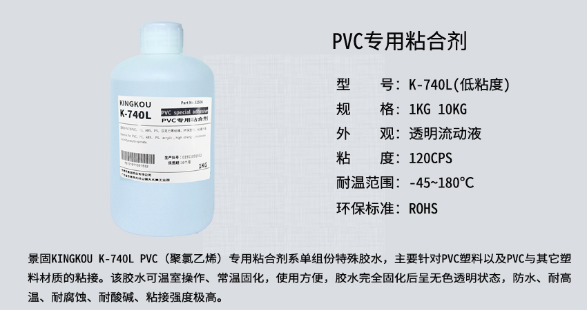 景固KINGKOU K-740 PVC(聚氯乙烯)專用粘合劑系單組份特殊膠水,主要針對PVC塑料以及PVC與其它塑料材質(zhì)的粘接。該膠水可溫室操作、常溫固化,使用方便,膠水完全固化后呈無色透明狀態(tài),防水、耐高溫、耐腐蝕、耐酸堿、粘接強度極高。